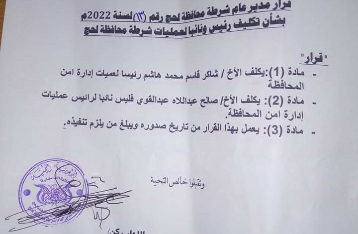 وجاء في القرار رقم ١٣ لسنة ٢٠٢٢م الصادر بتاريخ ٢٦ مايو قضت مادته الأولى بتكليف شاكر قاسم محمد هاشم رئيسا لعمليات أمن فيما قضت المادة الثانية من القرار بتكليف صالح عبداللاه عبدالقوي فليس نائبا لرئيس عمليات أمن المحافظة.