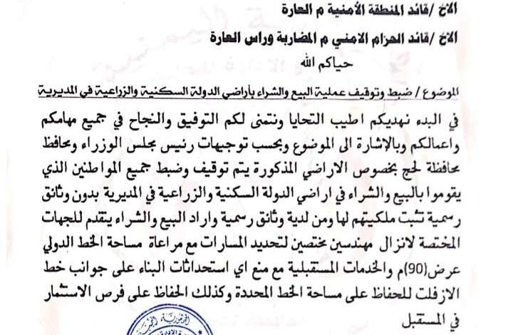 على نفس الصعيد وجه مدير عام مديرية المضاربة اقلام التوثيق والامناء الشرعيين بعدم إبرام أي عقود للأشخاص الذين لايمتلكون العقود التي تثبت ملكيتهم للاراضي