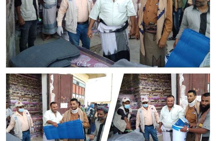 مدير قعطبة يدشن توزيع المواد الايوائية للنازحين في المخيمات