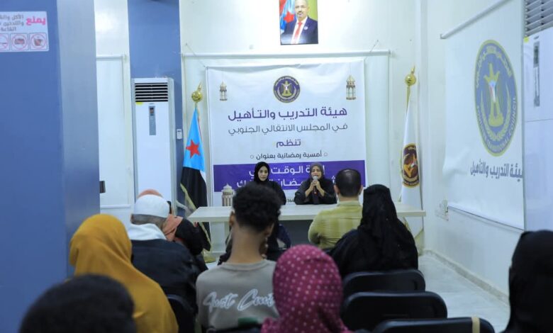 نظّمت هيئة التدريب والتأهيل المساعدة لهيئة رئاسة المجلس الانتقالي الجنوبي، مساء اليوم الأربعاء في العاصمة عدن، أمسية رمضانية بعنوان “إدارة الوقت في شهر رمضان المبارك”.