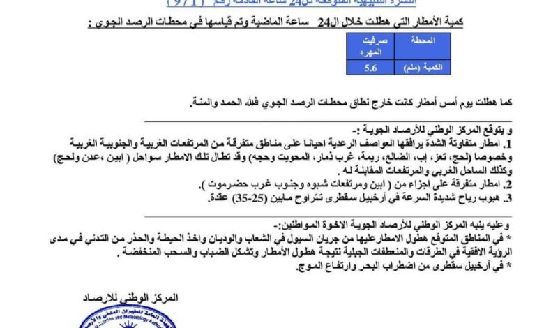 * في المناطق المتوقع هطول الامطارعليها من جريان السيول في الشعاب والوديان واخذ الحيطة والحذر من التدني في مدى الرؤية الافقية في الطرقات والمنعطفات. الجبلية نتيجة هطول الأمطار وتشكل الضباب والسحب المنخفضة .
