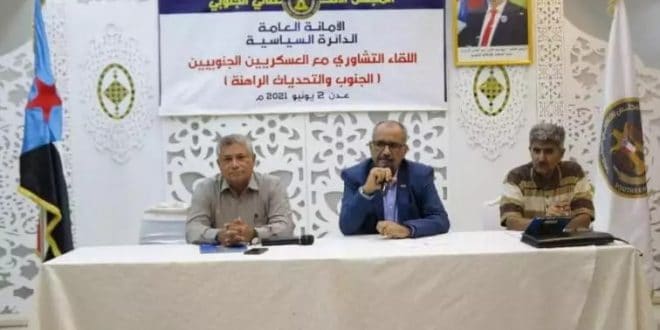 عقدت الدائرة السياسية في الأمانة العامة لهيئة رئاسة المجلس الانتقالي الجنوبي، يوم امس الأربعاء في العاصمة عدن، لقاءً تشاورياً مع العسكريين الجنوبيين تحت عنوان “الجنوب والتحديات الراهنة”.