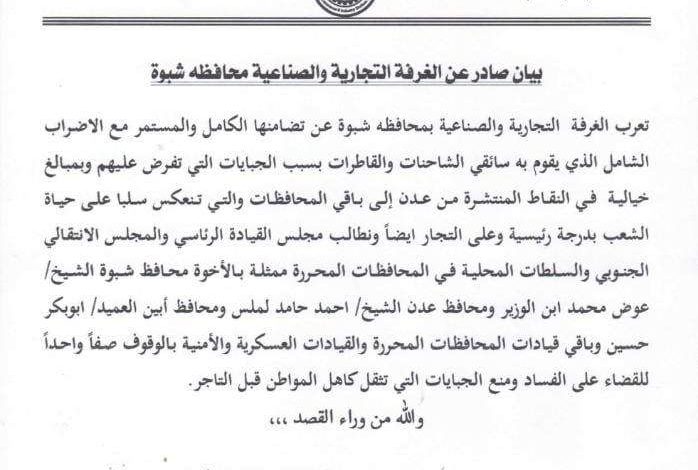 تعرب الغرفة التجارية والصناعية بمحافظة شبوة عن تضامنها الكامل والمستمر مع الاضراب الشامل الذي يقوم به سائقي الشاحنات والقاطرات بسبب الجبايات التي تفرض عليهم وبمبالغ خيالية في النقاط المنتشرة من عدن إلى باقي المحافظات ومن حضرموت وشبوة الل عدن والتي تنعكس سلبا على حياة الشعب بدرجة رئيسية وعلى التجار ايضا ونطالب مجلس القيادة الرئاسي والمجلس الانتقالي الجنوبي والسلطات المحلية في المحافظات المحررة ممثلة بالأخوة محافظ شبوة الشيخ عوض محمد ابن الوزير ومحافظ عدن الشيخ احمد حامد لملس ومحافظ أبين العميد ابوبكر حسين والقيادات العسكرية والأمنية بالوقوف صفا واحداً للقضاء على الفساد ومنع الجبايات التي تثقل كاهل المواطن قبل التاجر